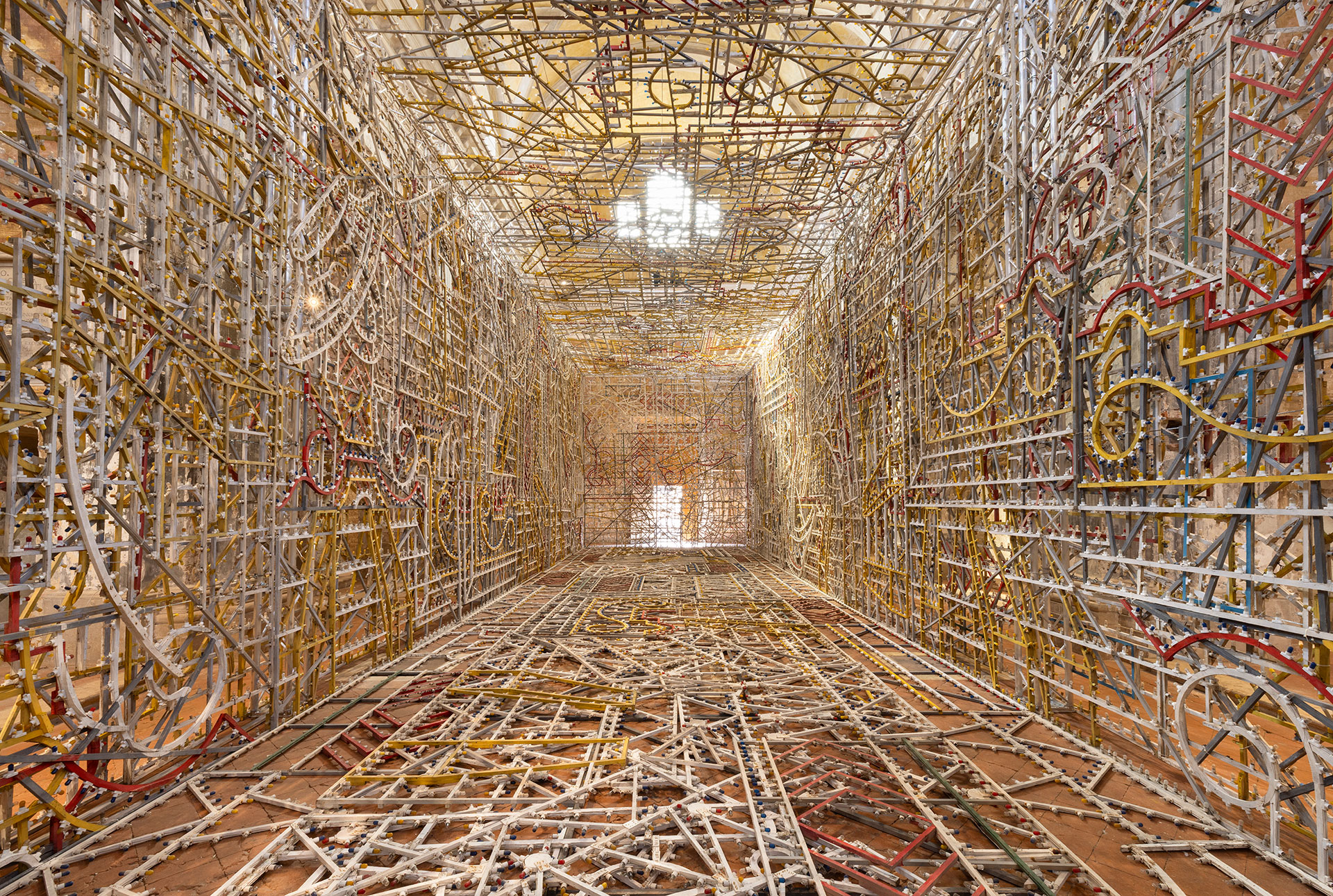 La navata della chiesa accoglie un intervento che incarna alcune delle costanti più emblematiche del lavoro di Bartolini: la