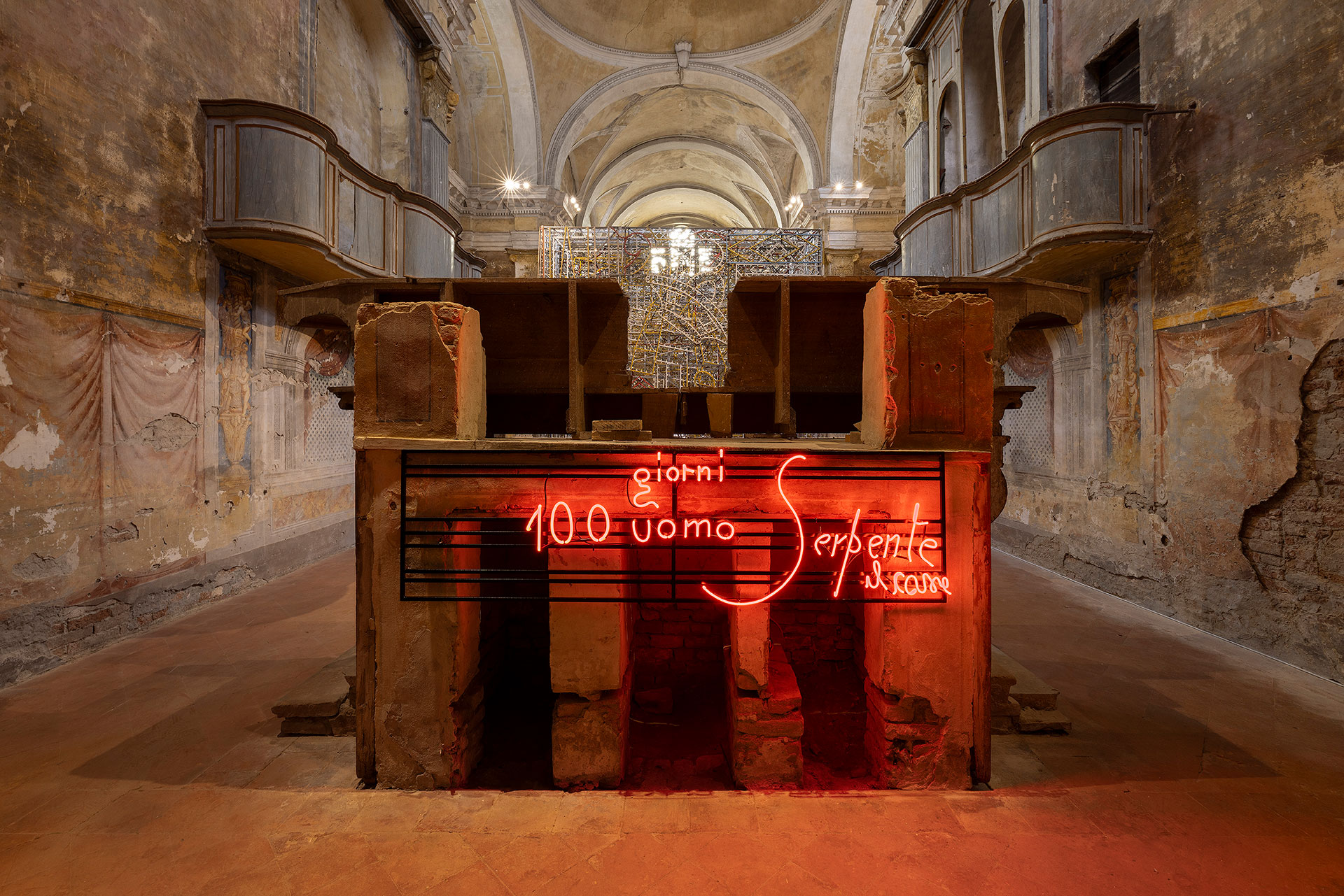 Sul retro dell’altare, al centro, un neon rosso si accende e restituisce luce e voce a due scritte murali rinvenute nel carcere