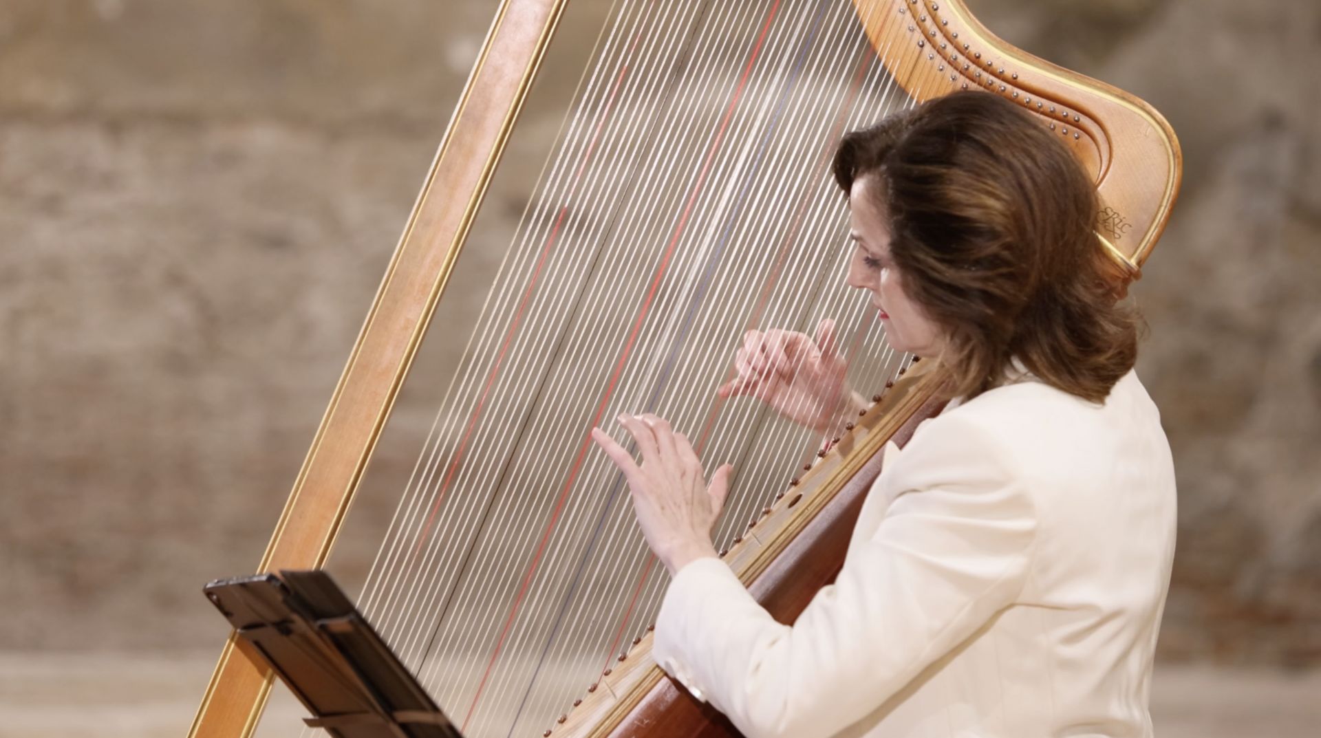La performance solista di Margret Koell sull'arpa tripla barocca risuona con i temi della mostra "And Rose" di Monica Bonvicini, intrecciando linguaggi musicali storici e contemporanei.